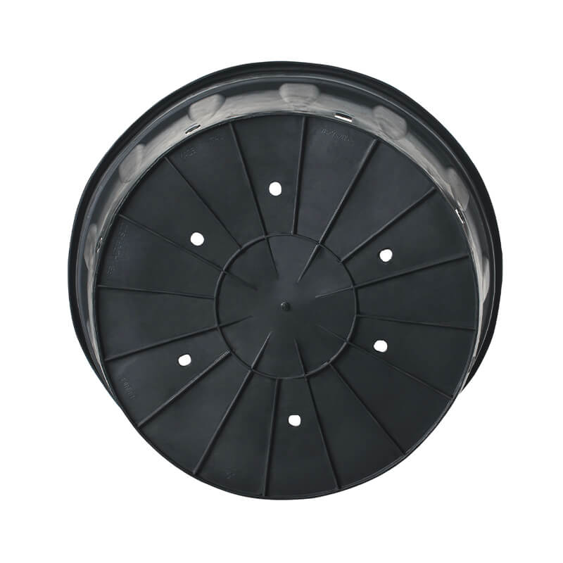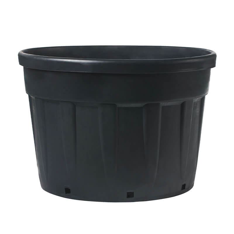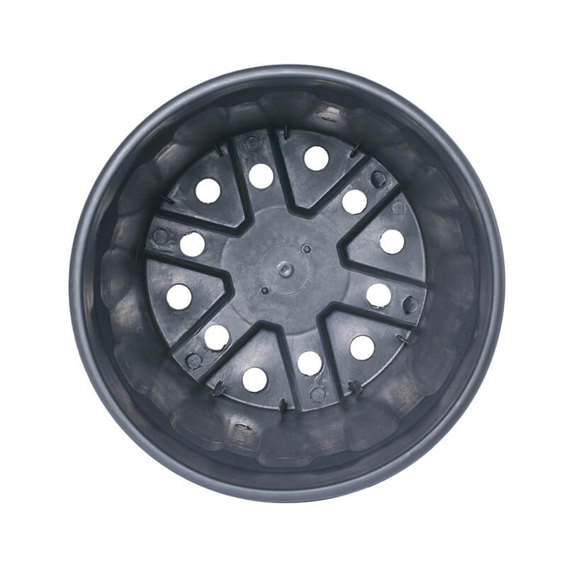 Maceta negra de polietileno reciclado posconsumo para el cultivo de plantas sin suelo.