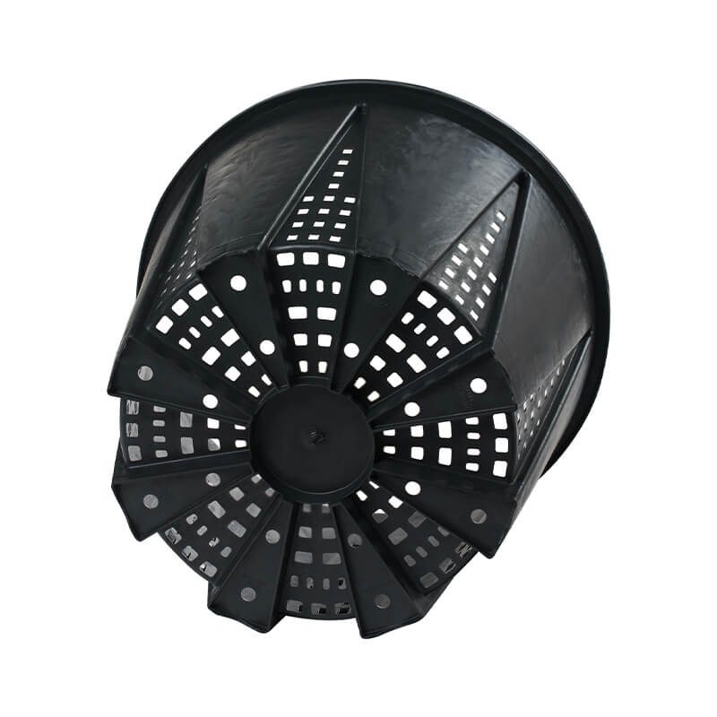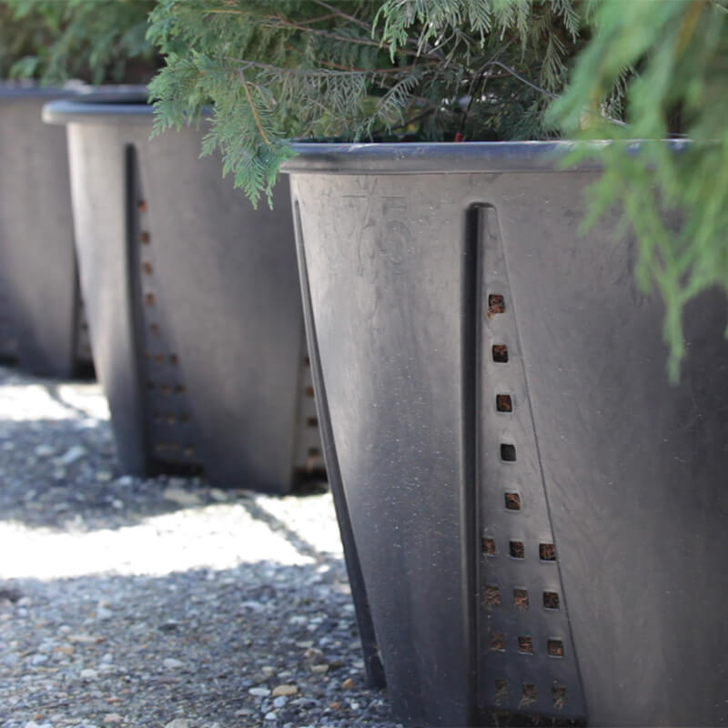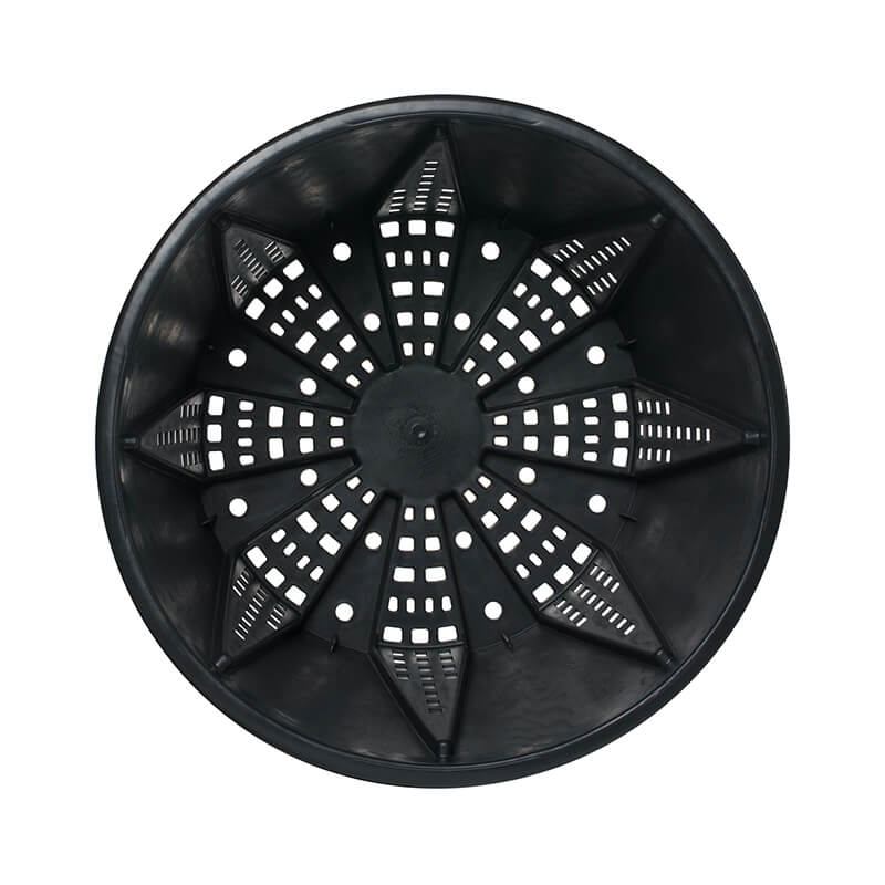 Varia es el contenedor ideal para el cultivo de plantas grandes: la mejor alternativa a la producción en campo abierto. La estructura de la pared está formada por ranuras perforadas que se extienden por todo el fondo de la maceta. Este diseño ha sido estudiado específicamente para mantener un nivel constante y óptimo de oxígeno en el sistema radicular de la planta; por otro lado, los bordes y las ranuras bloquean la fuerza expansiva de las raíces y contribuyen a potenciar el crecimiento del tallo. El crecimiento de las raíces es radial y uniforme en la maceta, mucho más rápido, gracias a la misma disposición de los agujeros que inhiben el proceso de espiralización. Este último efecto limita los trasplantes fallidos y garantiza plantas estables y sanas una vez plantadas. Los orificios de drenaje y los muelles colocados en el fondo de la maceta favorecen la expulsión del exceso de agua y evitan la formación de podredumbre, primera causa de la formación de ambientes insalubres y la consiguiente muerte de las plantas. Las paredes reforzadas lo convierten en un contenedor capaz de soportar los más dispares esfuerzos: las cargas, los desplazamientos y el apilamiento no son capaces de deformar su estructura. Varia exige una correcta utilización del sustrato, ya que el paso del oxígeno se produce a través del propio sustrato, haciendo que el uso de la fibra de coco sea imprescindible.