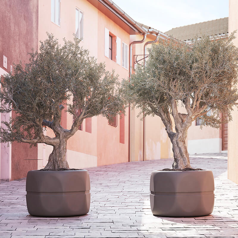 Ispirato ai grandi vasi in cemento ma con tutti i vantaggi del prodotto in plastica, questo vaso leggero e resistente ha il fondo ergonomico per la presa con muletto.