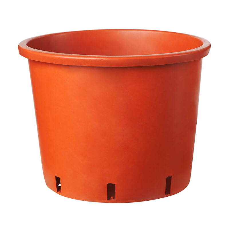 Vaso da vivaio basso realizzato in polietilene rigenerato post-consumo resistente agli sbalzi di temperatura ed estremamente flessibile. Sempre disponibile nel colore nero. Su richiesta anche in color cotto.